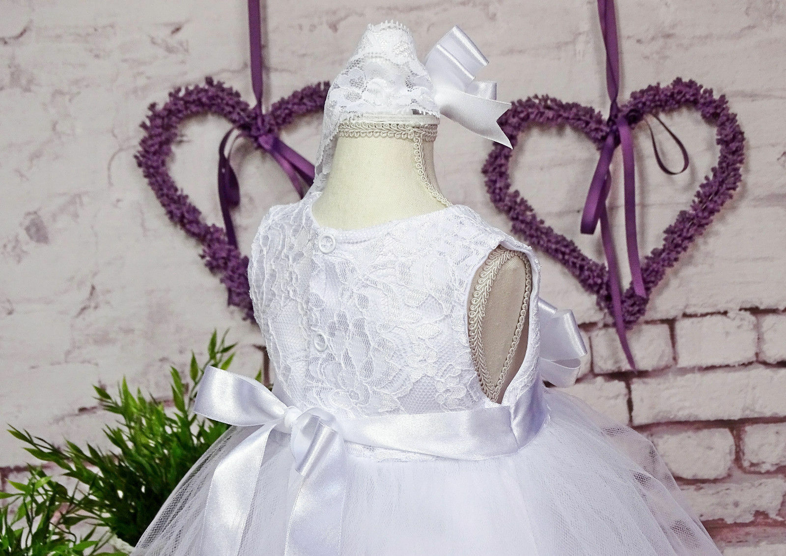 Taufkleid aus Spitze mit Satin und Tüll in einem weissen Farbton. Hinten wird es mit Drucknöpfen geschlossen.