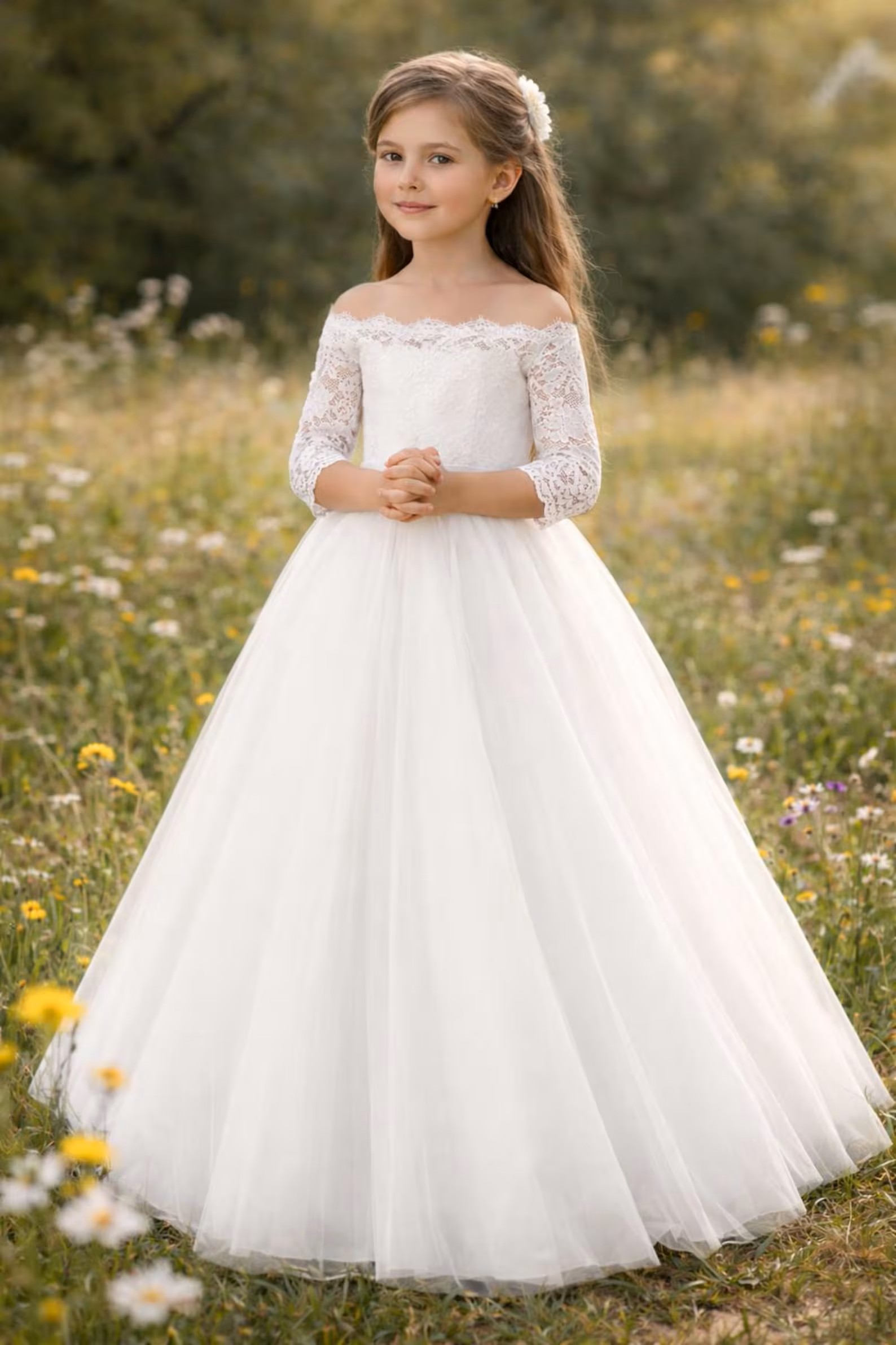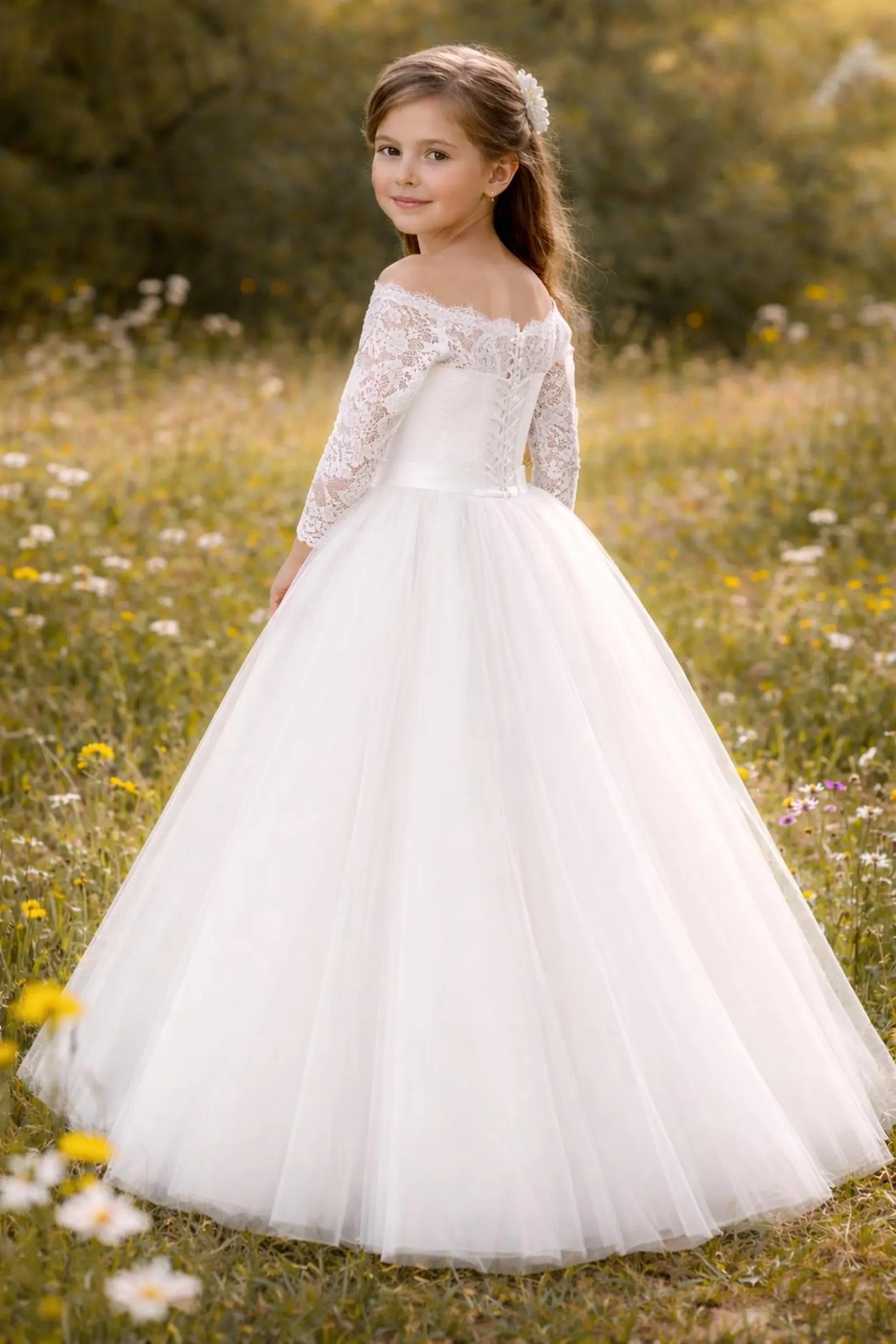 Dieses Kleid eignet sich perfekt für die Erstkommunion, als Blumenmädchenkleid bei Hochzeiten oder für festliche Familienfeiern.