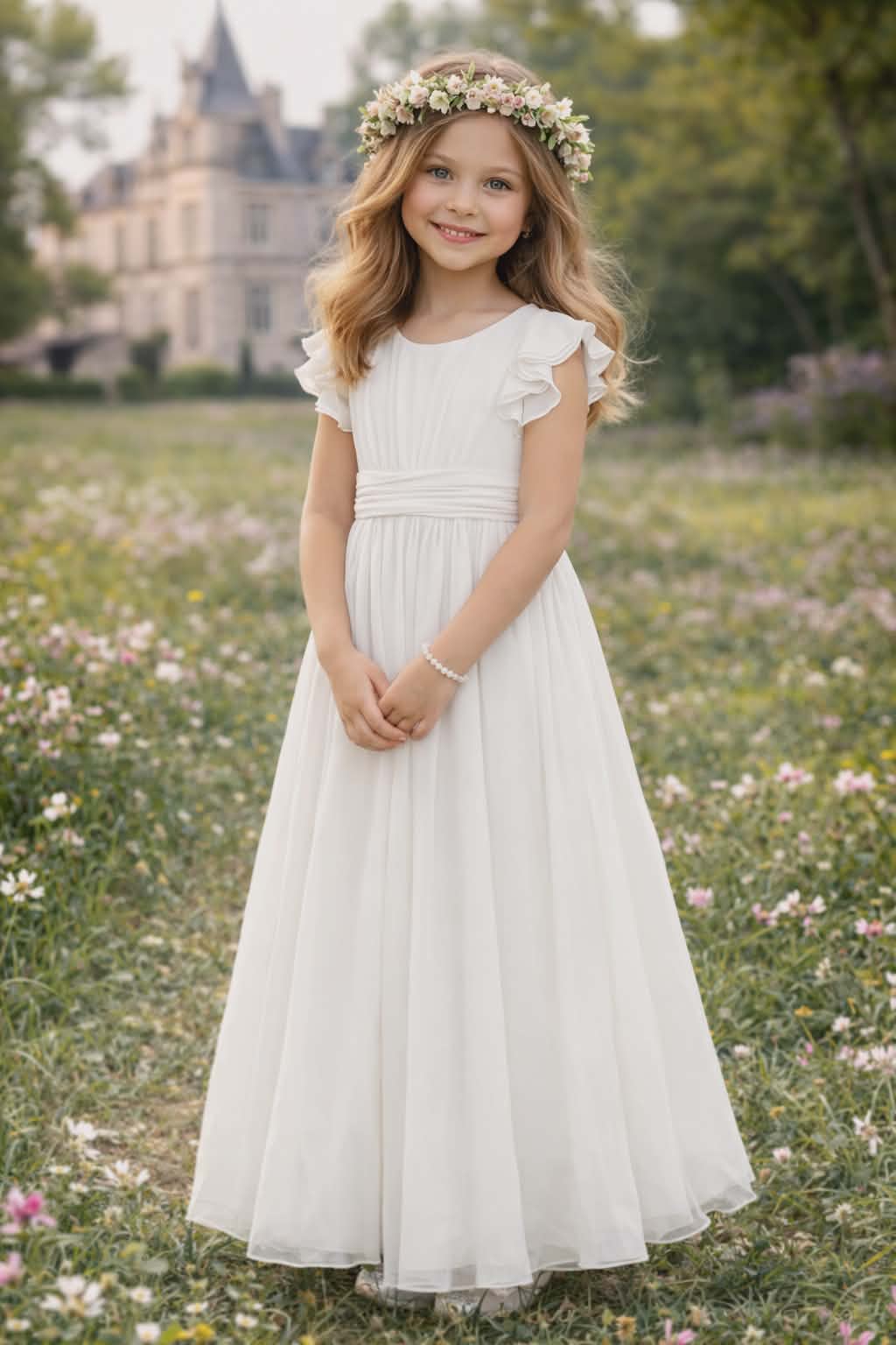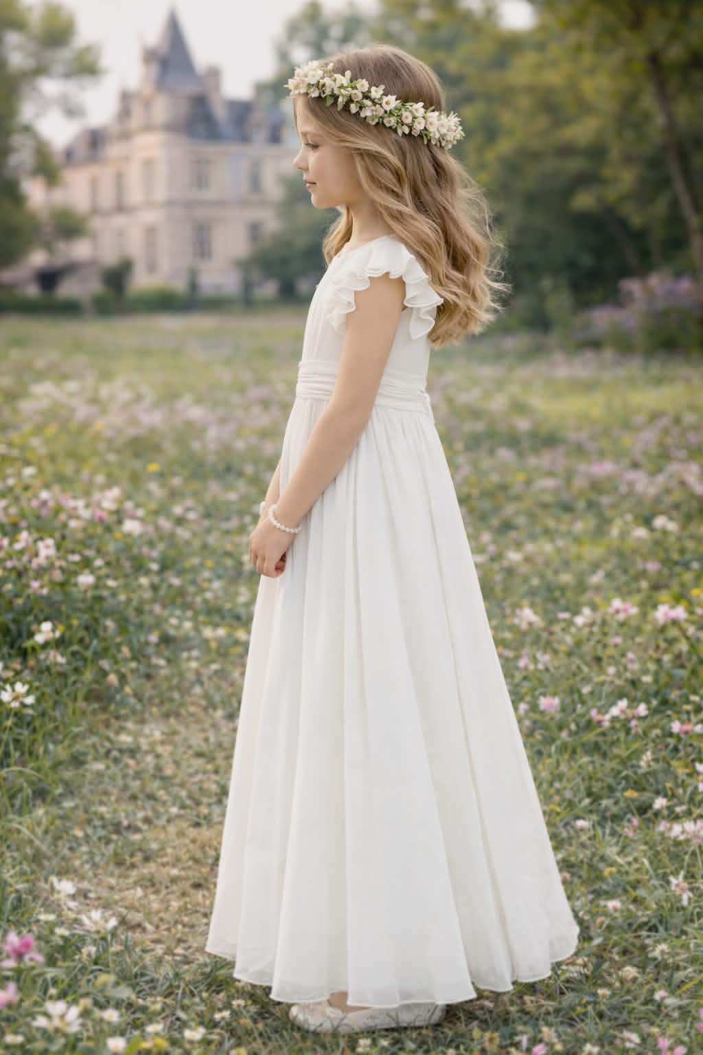 Die kurzen, zarten Flügelärmel verleihen dem Kleid eine romantische Note. Die leicht geraffte Taille betont die klassische Silhouette, während der lange, weich fallende Rock dem Kleid eine besonders festliche Wirkung verleiht.