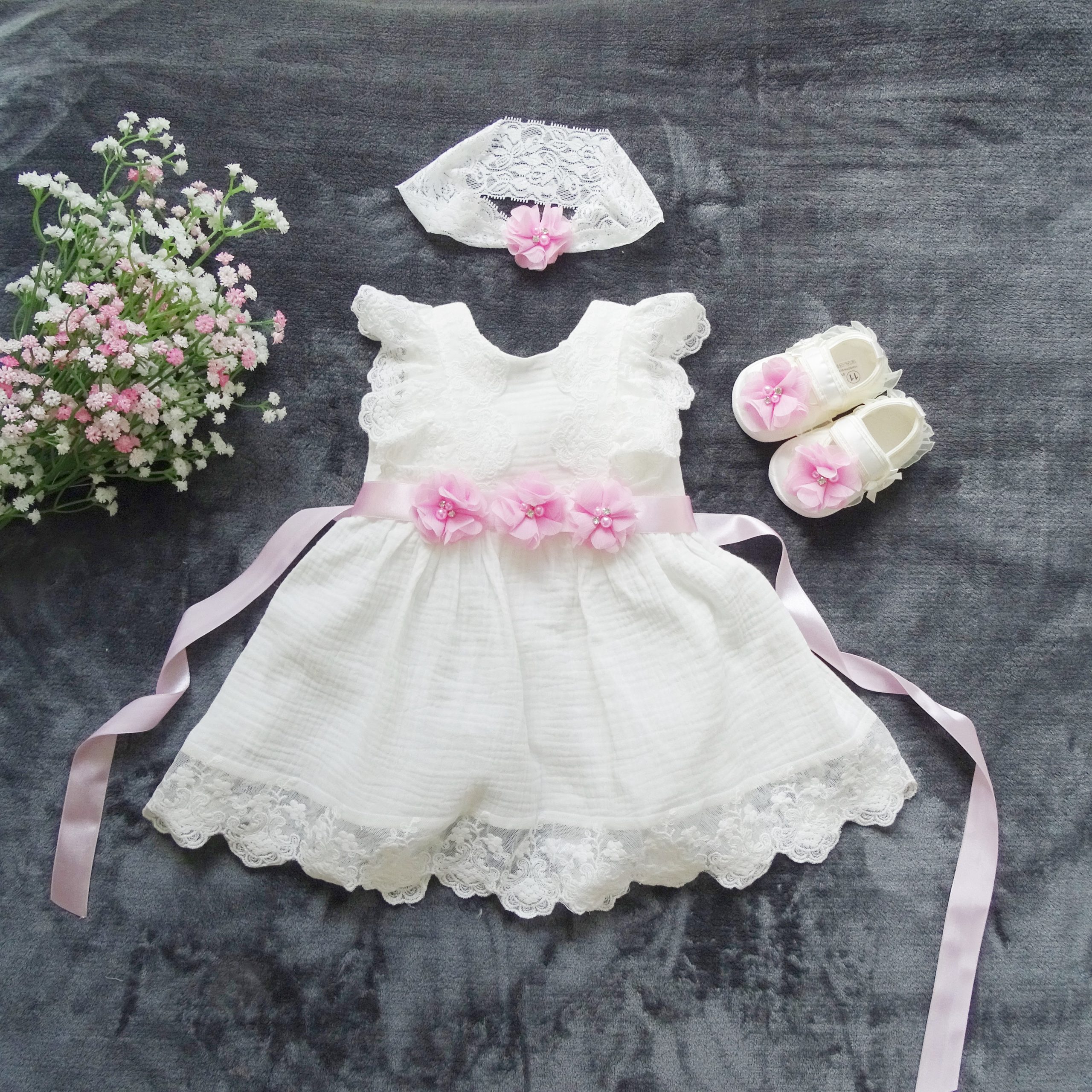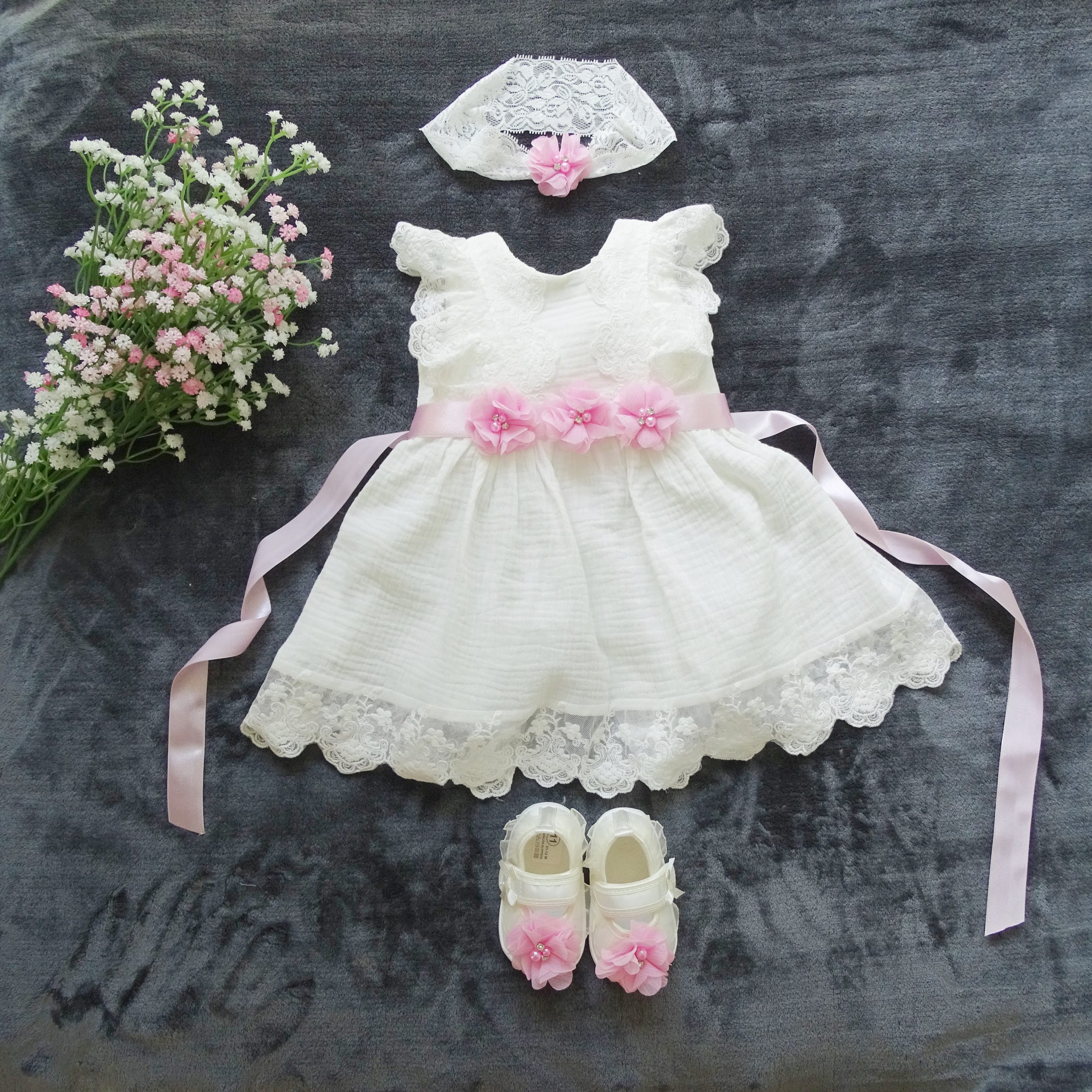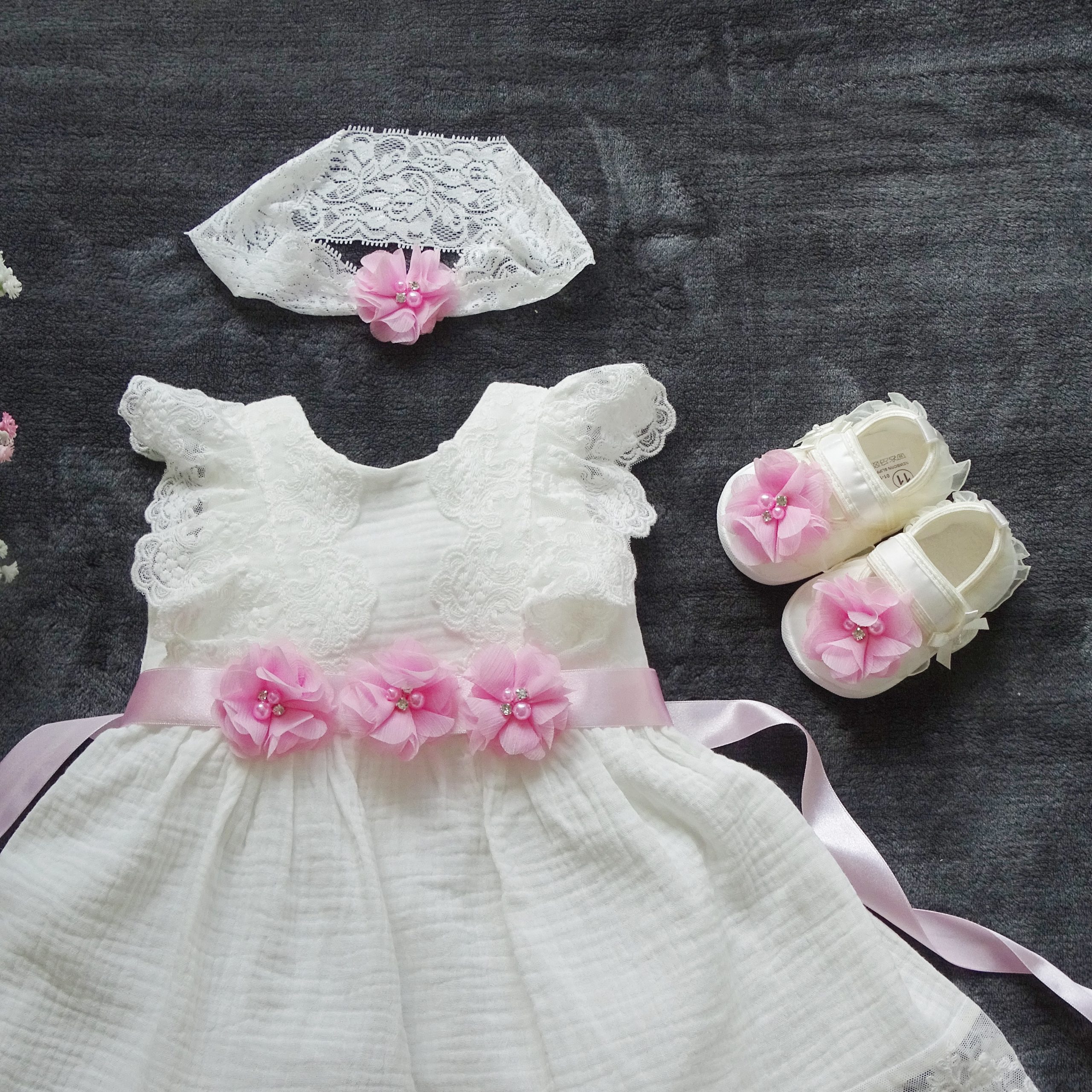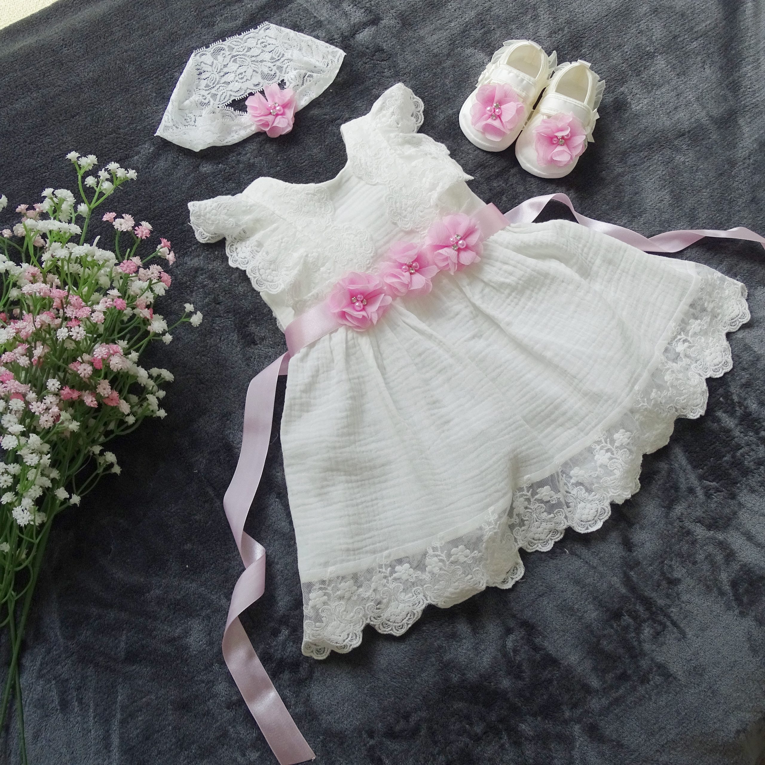 Musselin 100% Baumwolle Taufkleid, +Stirnband Farbe: ecru (Kopie)
