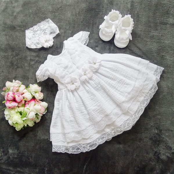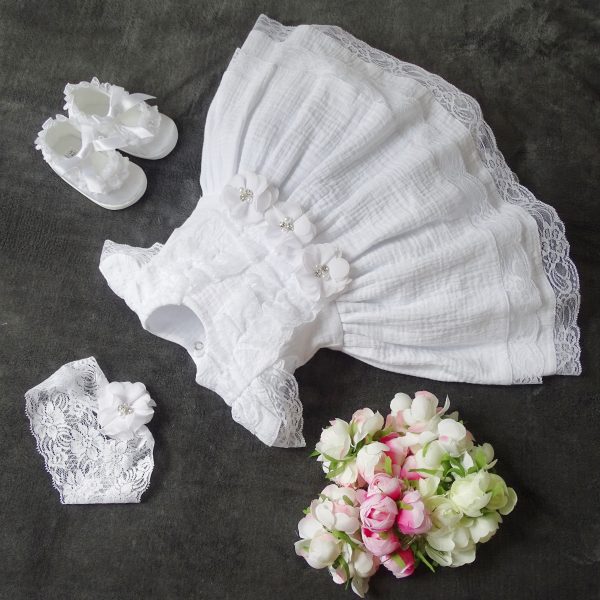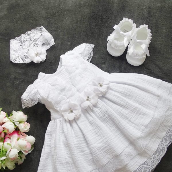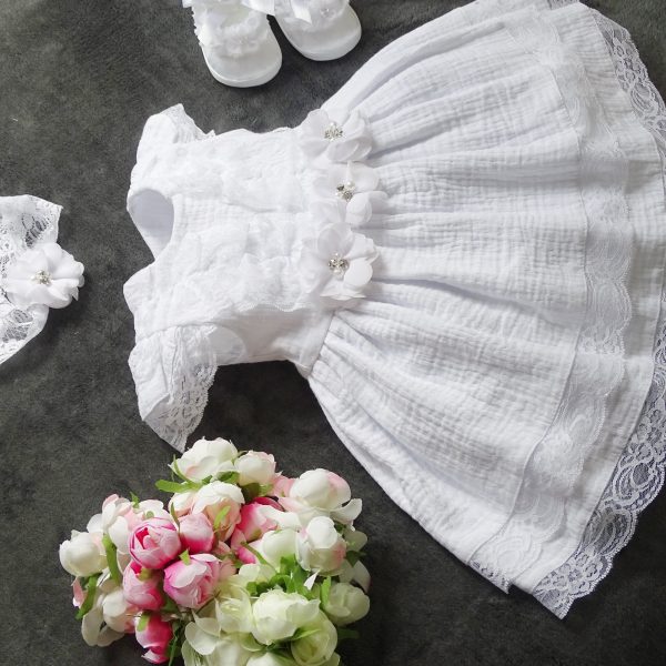 Taufkleid 100% Baumwolle – Musselin mit Spitze. Hinten wird es mit Drucknöpfen geschlossen.