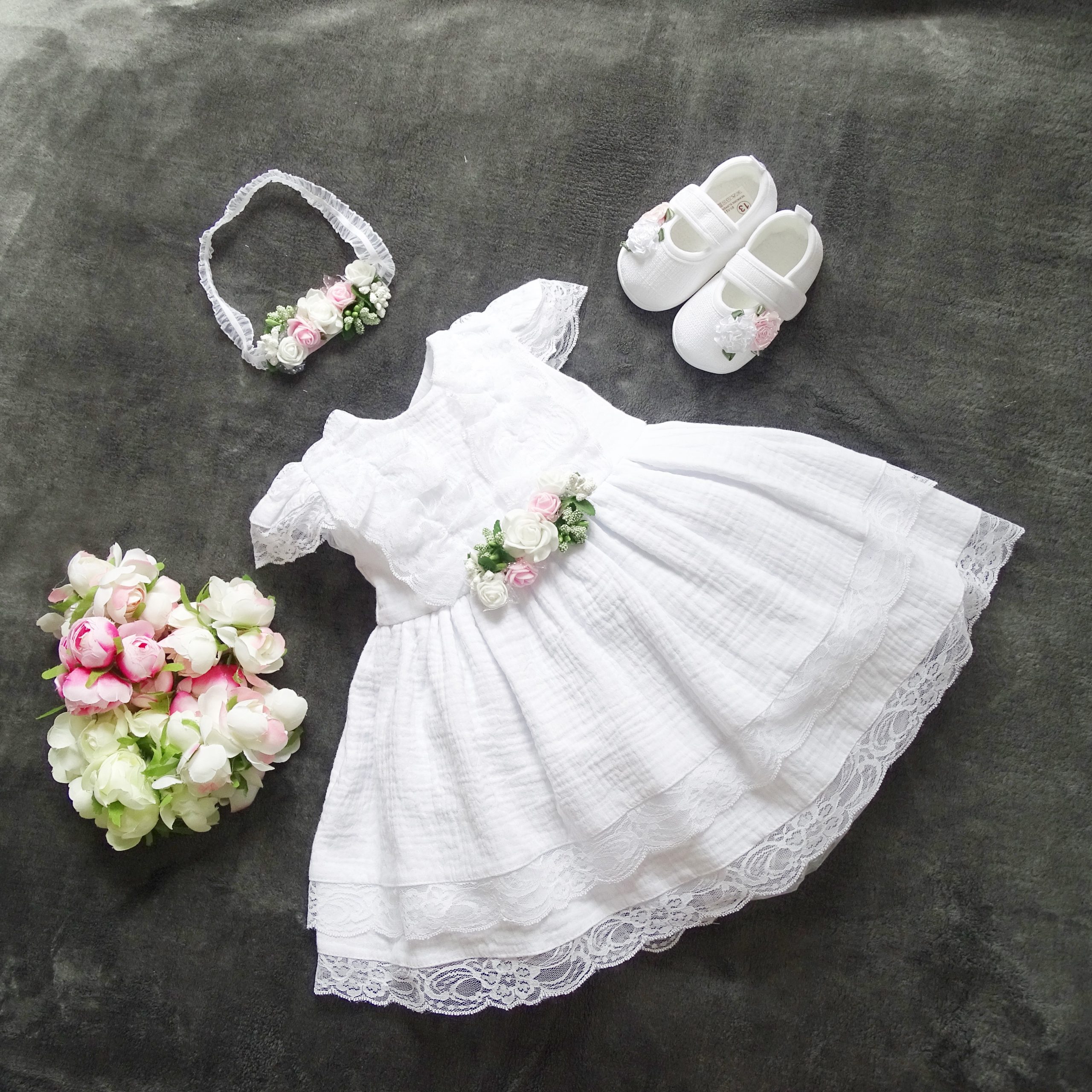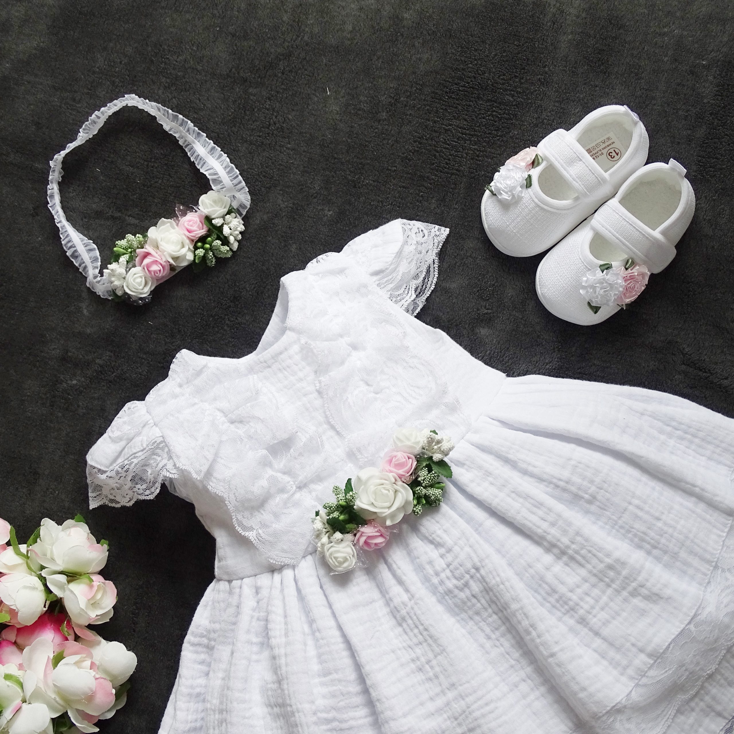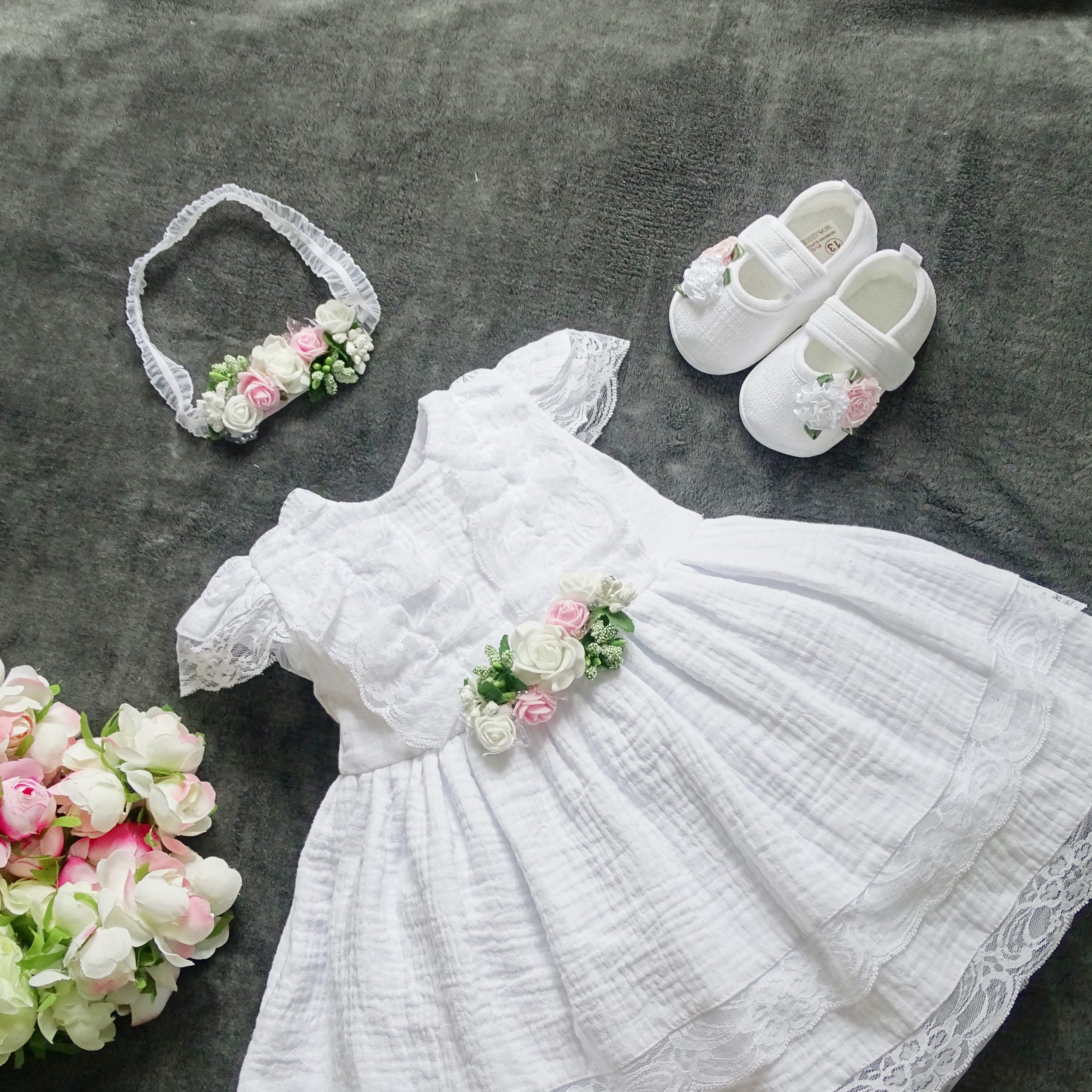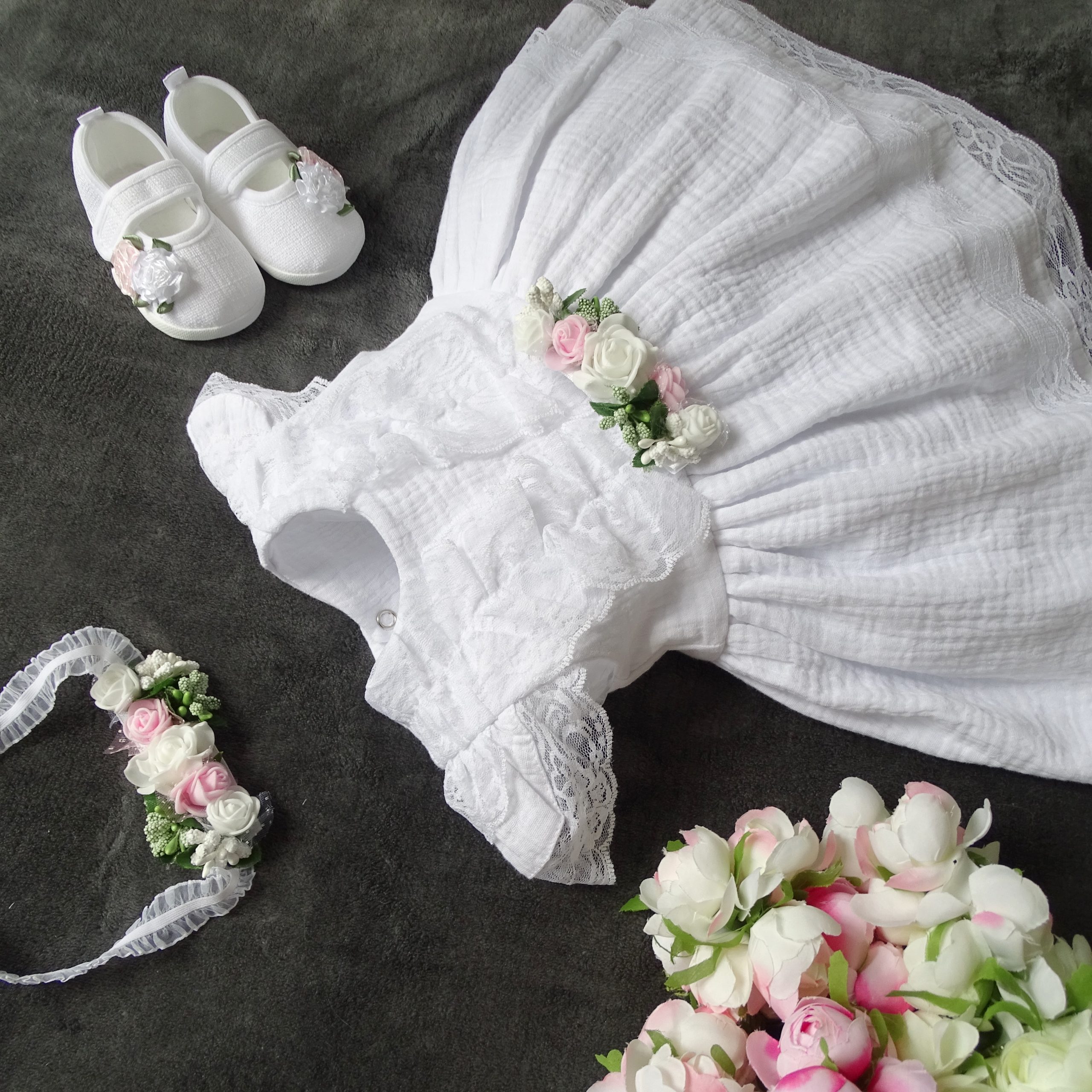 Taufkleid 100% Baumwolle – Musselin mit Spitze. Hinten wird es mit Drucknöpfen geschlossen.