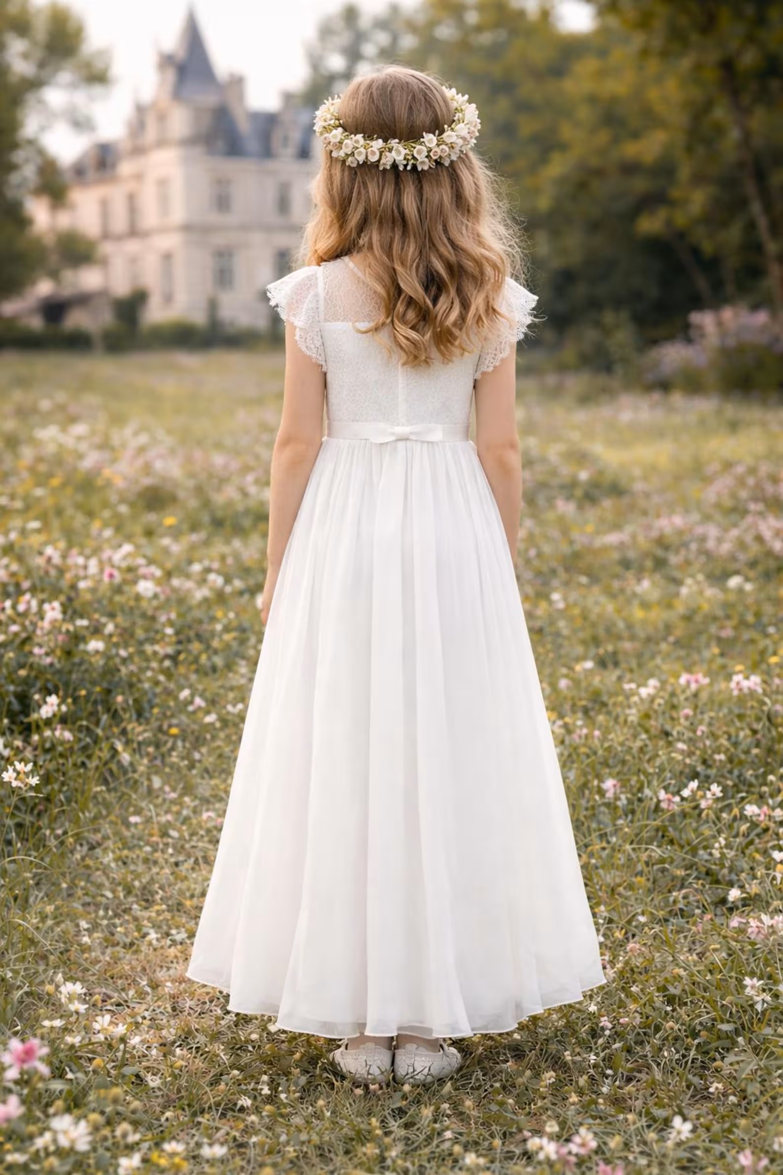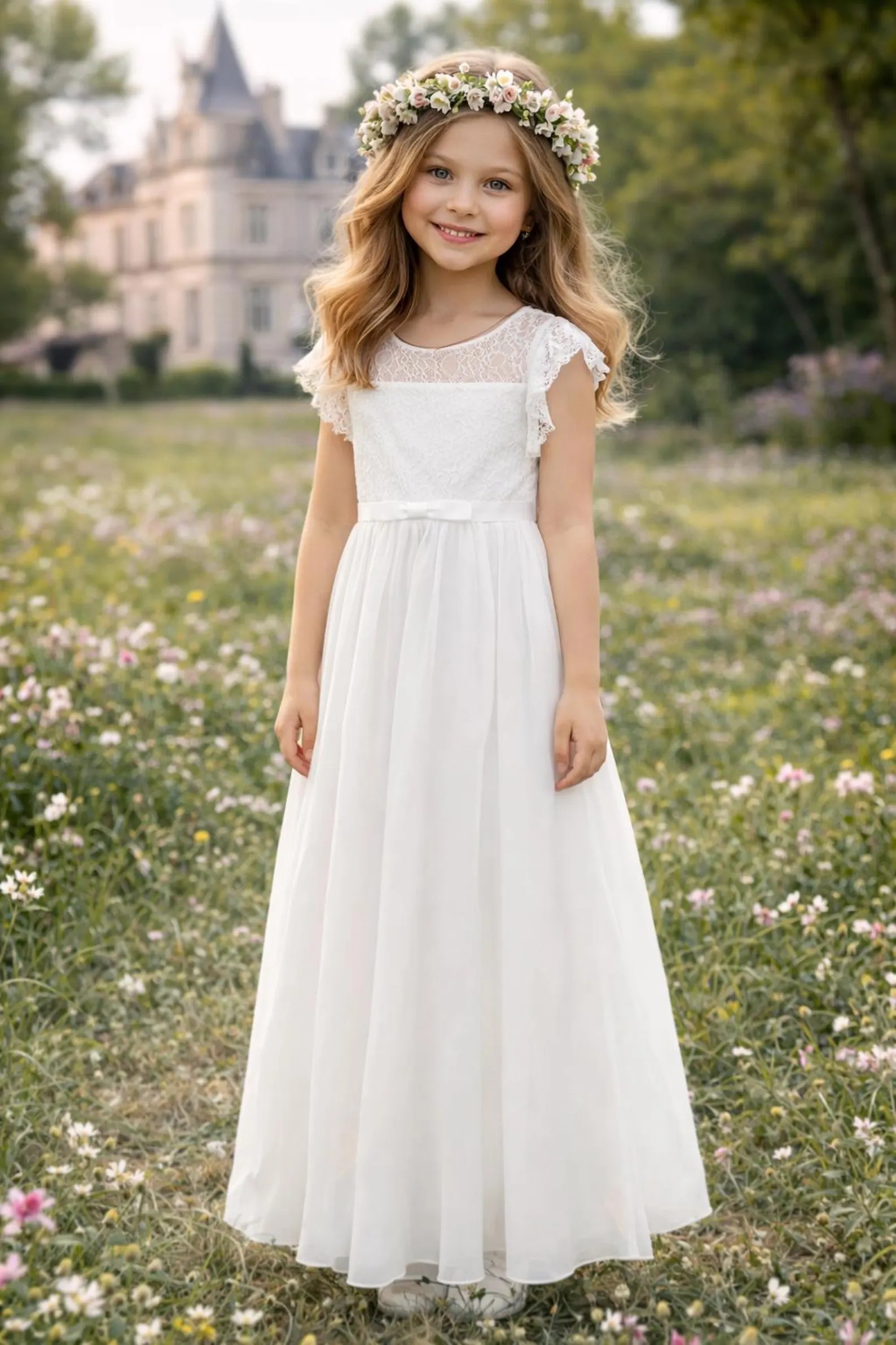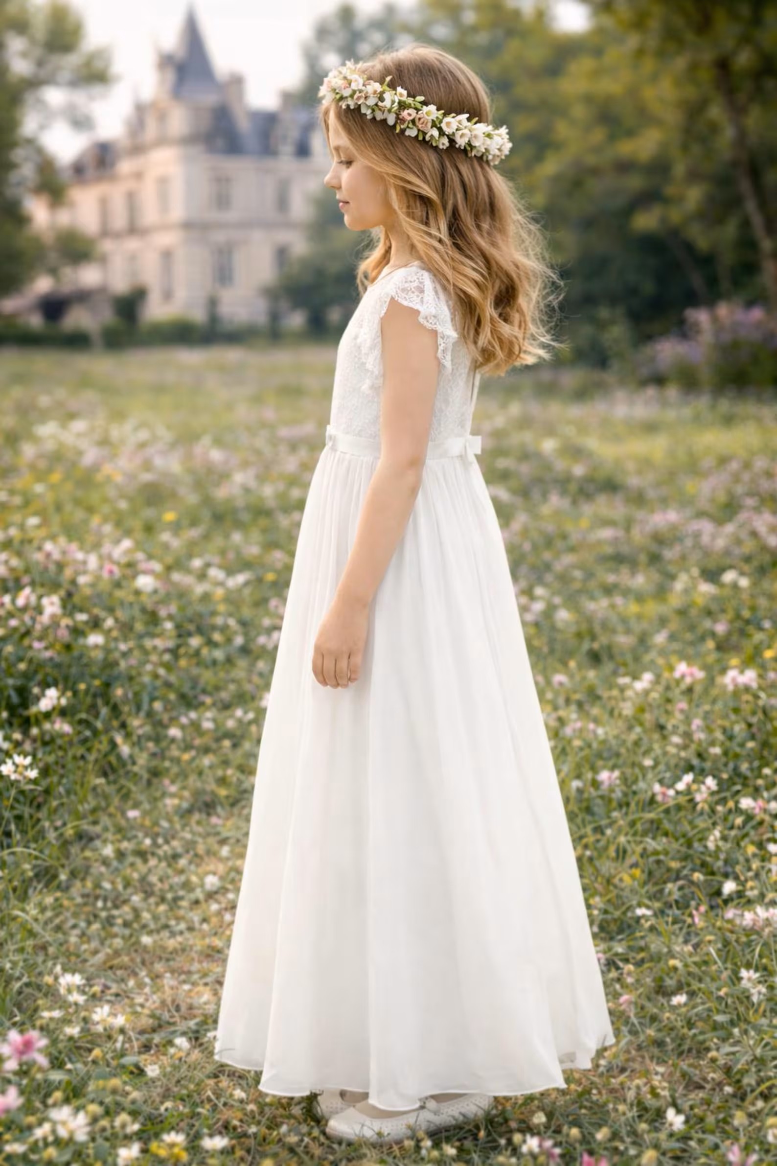 Dieses Kleid ist ideal für die Erstkommunion, als Blumenmädchenkleid bei Hochzeiten oder für andere festliche Familienfeiern.